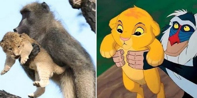 O contexto da cena tão belo quanto no filme, apesar de não ter a música ‘Ciclo da Vida’ tocando ao fundo. O macaco em questão viu outros babuínos cercando o pequeno leão e, com seu instinto protetor, pegou o filhote no colo e o levou para o topo de uma árvore.