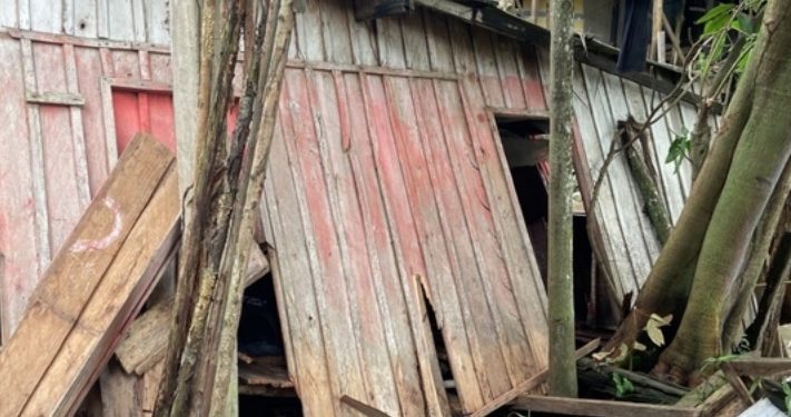 MANAUS – A casa onde moram a dona de casa Rosilene Monteiro Dutra, de 41 anos, e os quatro filhos, desabou na manhã deste sábado (18), menos de uma semana após a tragédia que tirou oito vidas em um deslizamento em Manaus. A residência de madeira que fica na rua Cristo Reis, na Compensa, zona oeste, ainda está com parte dos pertences da família.