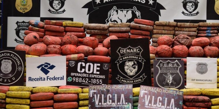 MANAUS-AM|A Operação integrada entre a Polícia Civil, Polícia Militar, Receita Federal e Ministério da Justiça e Segurança Pública prendeu, em flagrante, cinco brasileiros fazendo o transporte de drogas no Rio Solimões, no Amazonas. Durante a ação, deflagrada nessa quinta-feira (09/04) em Manacapuru (a 68 quilômetros de Manaus), foram apreendidos 630 quilos de entorpecentes, incluindo cocaína negra – narcótico nunca antes encontrado no estado.