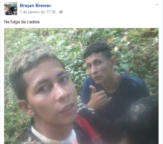 Brayan Bremer Quintelo Mota, que cumpria prisão por tráfico de drogas, postou na noite de domingo uma foto com o parceiro de fuga comemorando com o texto “Fulga da cadeia”. Já na tarde de ontem, ele voltou a postar no Facebook uma foto onde dizia que estava a caminho do município de Maués (distante 268km de Manaus).