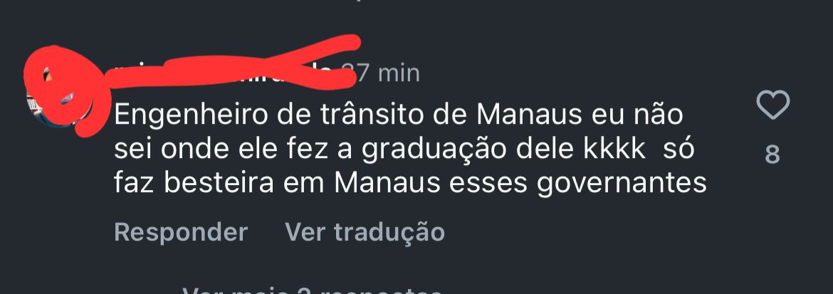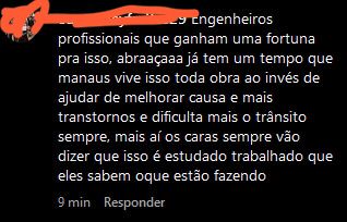“Engenheiros profissionais que ganham uma fortuna pra isso, abraaçaaa já tem um tempo que manaus vive isso toda obra ao invés de ajudar de melhorar causa e mais transtornos e dificulta mais o trânsito sempre, mais aí os caras sempre vão dizer que isso é estudado trabalhado que eles sabem oque estão fazendo”, escreveu um usuário.