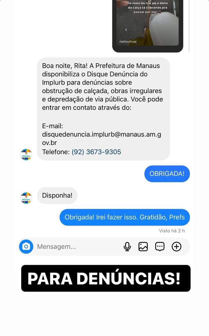 Após a divulgação do vídeo, o Instituto Municipal de Planejamento Urbano (Implurb) entrou em contato com Rita e disponibilizou um número para denúncias sobre obstrução de calçadas, obras irregulares e depredação de vias públicas.