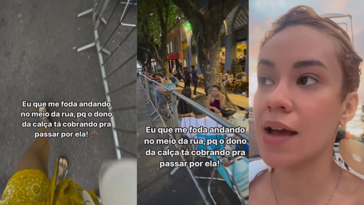 “Eu que me foda andando no meio da rua, pq o dono da calçada tá cobrando por ela”, legendou ela nas imagens.