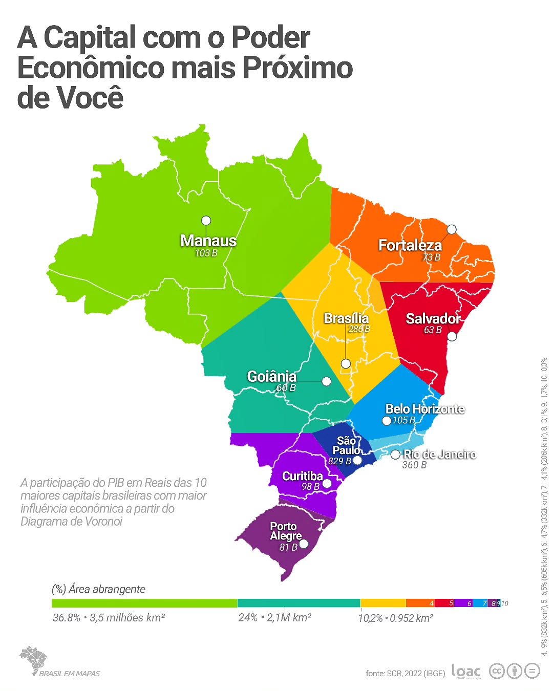 O Diagrama de Voronoi, método que mapeia a influência geográfica das capitais com base no PIB, mostra que Manaus domina uma extensão territorial maior que a de qualquer outra cidade no top 5, incluindo São Paulo, cuja área de influência abrange apenas 1,7% do país. Enquanto isso, o Rio de Janeiro, segunda colocada em PIB, tem a menor abrangência (0,3% do território), mas concentra riqueza e infraestrutura no Sudeste.