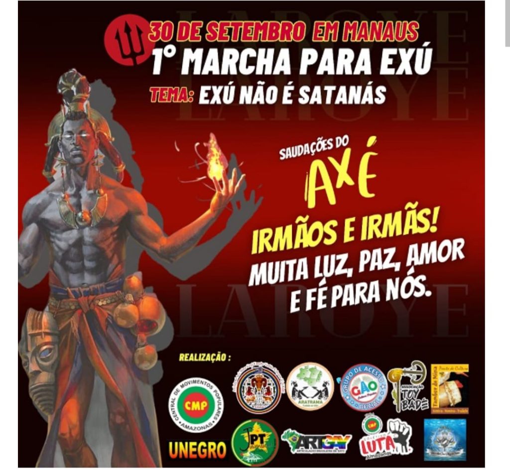 MANAUS (AM) – Manaus recebe pela primeira vez, no dia 30 de setembro, a 1ª Marcha para Exú. O evento acontece na Praça da Polícia com destino final na Praça do Congresso, ambas no Centro da caputal. O tema será “Exú não é satanás” e tem como objetivo ressignificar o culto ao orixá de religião de matriz africana.