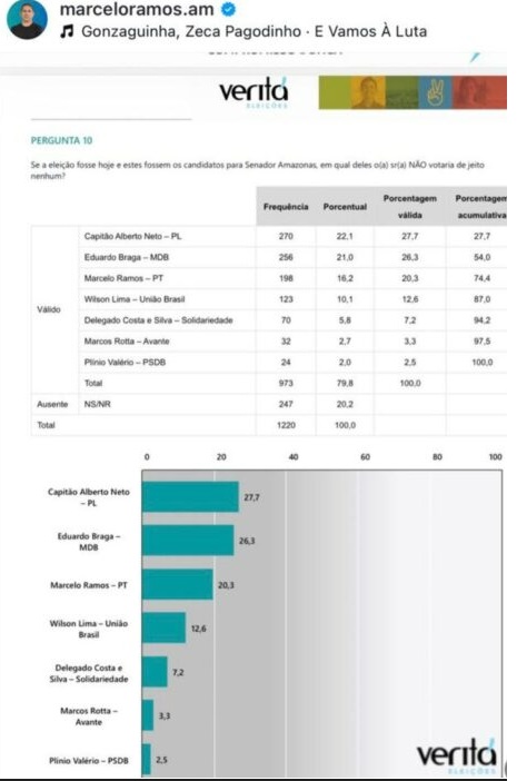 “Mais uma pesquisa de um instituto nacional me coloca em terceiro na disputa para o Senado, desta vez com um resultado ainda mais competitivo, mesmo sem pré-campanha. Isso só demonstra que o povo do Amazonas deseja uma candidatura do campo progressista e democrático, que represente um projeto do presidente Lula”, dizia ele na postagem.