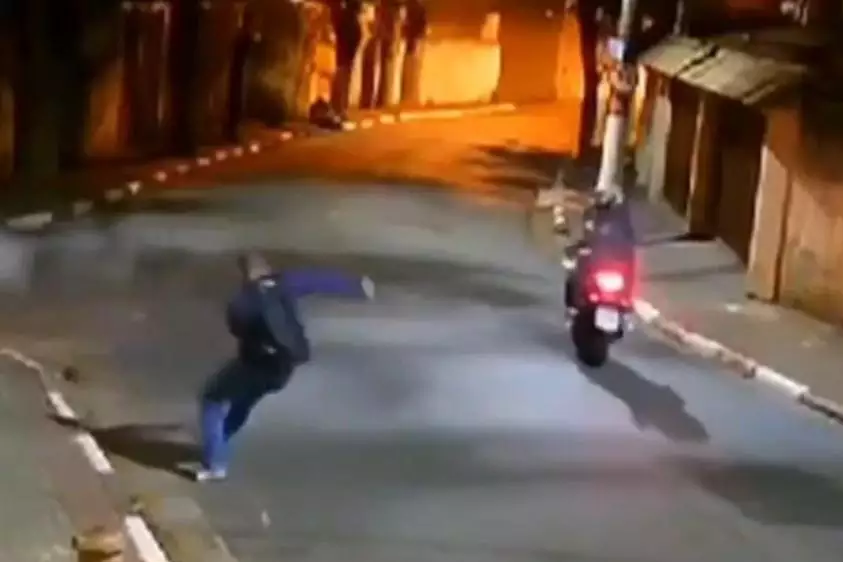 O alvo estava andando pela rua, de noite, e percebe que uma moto está se aproximando. Ele também está armado, chega a sacar a pistola, mas os criminosos já disparam os tiros na direção dele.