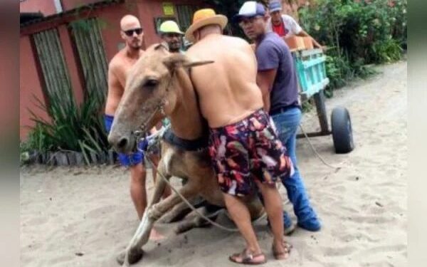 BAHIA | Uma cena de maus-tratos foi flagrada, nesta quinta-feira (21/10), em Caraíva, distrito de Porto Seguro (BA), na Costa do Descobrimento. Um cavalo puxava uma carroça carregada de material de construção quando caiu e não conseguiu se levantar.