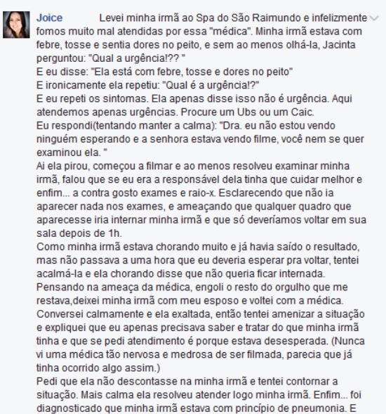Manaus – A atitude da médica Jacinta Souza está causando polêmica nas redes sociais e provocando um debate sobre qual deve ser a postura de um profissional da saúde com relação a pacientes. O caso aconteceu no Pronto Socorro do São Raimundo, Zona Oeste de Manaus.