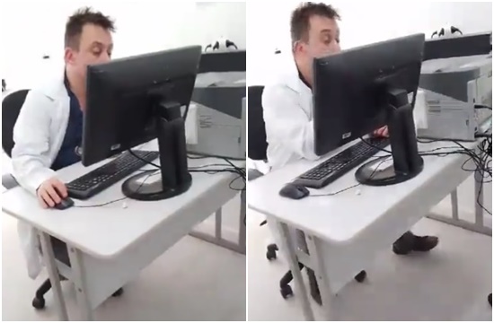 O homem aparece bastante agitado, cambaleia na cadeira e digita de forma estranha no computador.