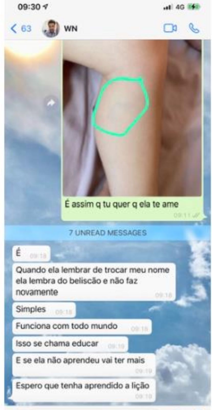 Em uma das ocasiões em que a garotinha apareceu com a perna roxa, Wilson confessou a agressão por meio do WhatsApp e afirmou que foi para ‘educar’.