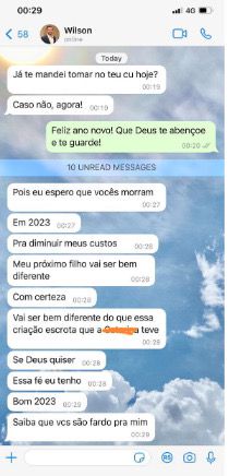 “Pois eu espero que vocês morram em 2023 pra diminuir meus curtos. Meu próximo filho vai ser bem diferente com certeza. Vai ser bem diferente do que essa criação escrota que a (nome da filha) teve. Se Deus quiser. Essa fé eu tenho. Bom 2023. Saiba que vcs são fardo pra mim”.