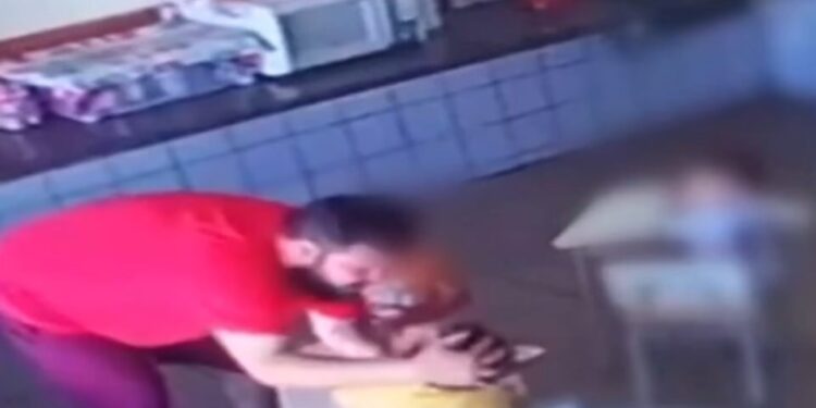 O assistente então pega a mão da criança e bate contra a carteira. Em seguida, ele dá tapas no rosto do menino. Ele ainda segura e balança a cabeça do garoto com as duas mãos.