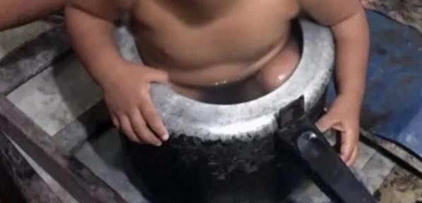 Conforme informações da mãe do menino, ele estava brincando quando ela notou que o filho havia entrado dentro da panela. Suas pernas haviam ficado entrelaçadas e o bebê tentava sair, mas não conseguia.