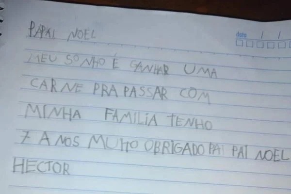 “Papai Noel, meu sonho é ganhar uma carne para passar com a minha família, tenho 7 anos, muito obrigado Papai Noel”, escreveu o menino na carta. Comovida com o pedido, a mãe de Hector, Patrícia Braz, criou uma vaquinha para arrecadar dinheiro e realizar o desejo do filho.