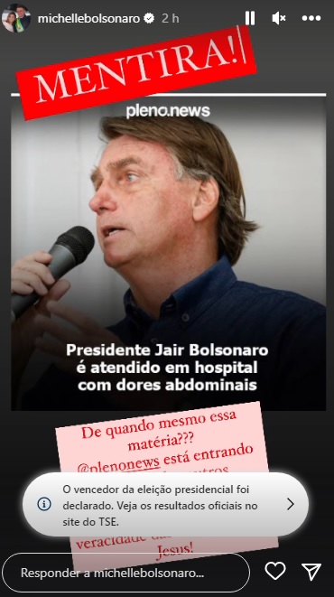 BRASIL – Horas após a notícia de que o presidente Jair Bolsonaro (PL) foi internado nesta sexta-feira (18) em um hospital das Forças Armadas, em Brasília, a primeira-dama Michelle Bolsonaro postou no instagram que seu marido está bem. “É mentira”, publicou a esposa.