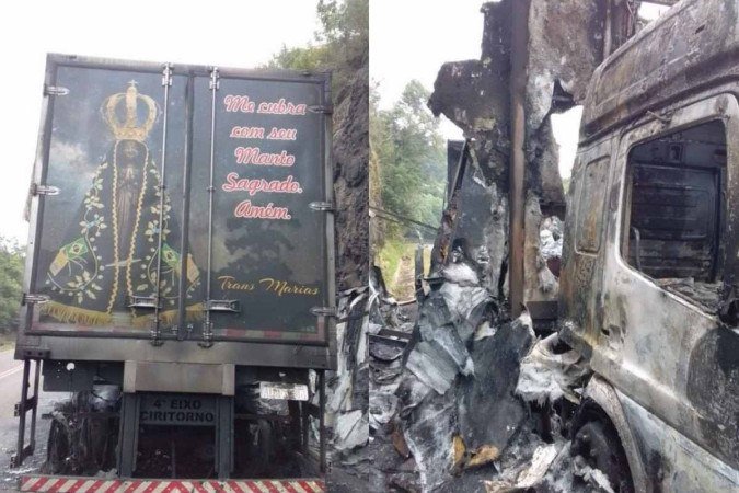 LARANJEIRAS DO SUL (PR) – Um milagre. Assim pode ser descrito o que aconteceu após um caminhão pegar fogo na BR-158, próximo de Laranjeiras do Sul, no Paraná (PR), na última terça-feira (4). O baú do veículo ficou totalmente destruído pelas chamas, mas as portas traseiras, com a imagem impressa de Nossa Senhora Aparecida, permaneceram intactas.