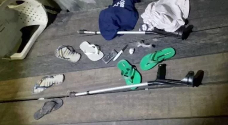 Os policiais foram até o local e o suspeito, ao ver que seria preso, largou as muletas e correu para tentar fugir. O desespero foi tanto que até um barranco ele teria escalado, mas mesmo assim foi alcançado.