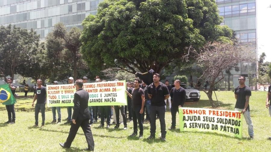Vestidos de preto, eles seguram faixas com suas reivindicações. Em uma delas, pedem que Bolsonaro “ajude” seus soldados a serviço da pátria. Em gritos de guerra, entoam o lema do governo “Brasil acima de tudo, Deus acima de todos”.
