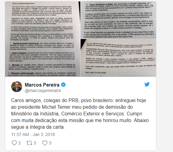 Na carta de três páginas, Marcos Pereira faz um balanço das ações de sua gestão no ministério, iniciada em maio de 2016. Ele registra que “assumimos um governo falido, despedaçado, com todos os índices econômicos negativos e sem perspectiva de melhora de vida” e que o governo enfrentou os desafios e o país “encontrou seu curso novamente”.