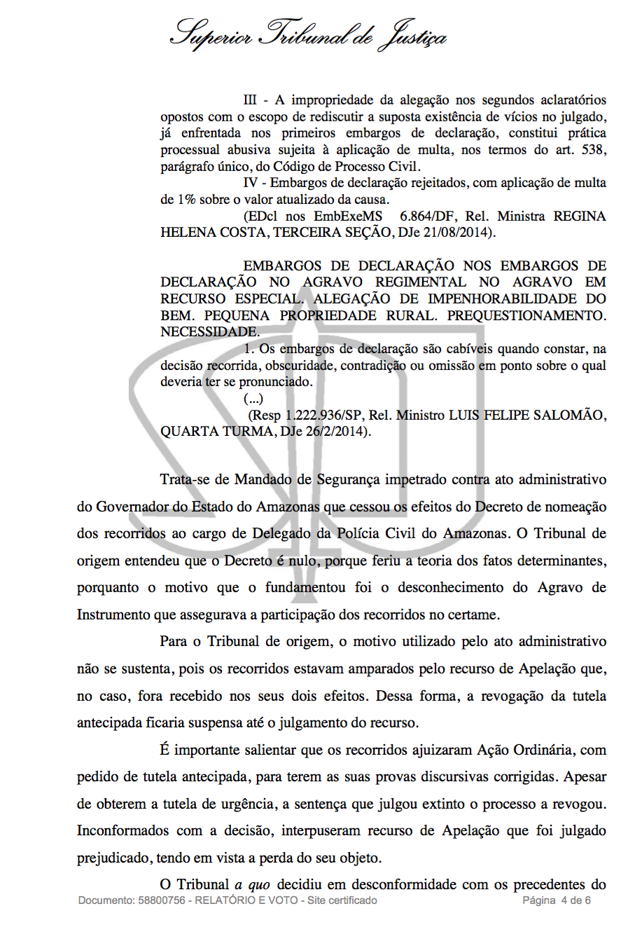 Manaus – Por unanimidade de votos, a Segunda Turma do Superior Tribunal de Justiça (STJ) decidiu manter o ato assinado pelo então governador Omar Aziz (PSD) que, em junho de 2012, anulou o decreto de nomeação de cinco delegados que assumiram a função policial mesmo tendo sido reprovados no concurso público da Polícia Civil, realizado em 2009.