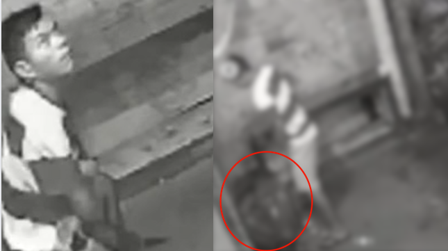 Nas imagens ele se aproxima e oferece algo para ela, parece ser um envelope com pó branco, depois ele passa a se masturbar por cima da calção enquanto olha em volta.