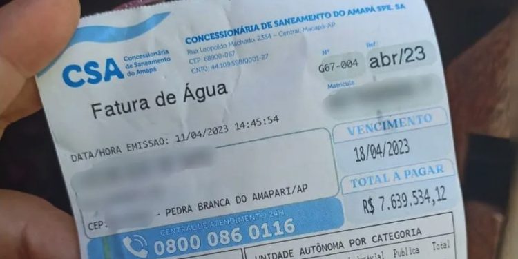 MACAPÁ (AP) – Uma moradora foi surpreendida ao receber uma fatura de água no valor de R$ 7,6 milhões referente ao mês de abril. O caso aconteceu em Pedra Branca do Amapari, distante cerca de 183 quilômetros de Macapá.