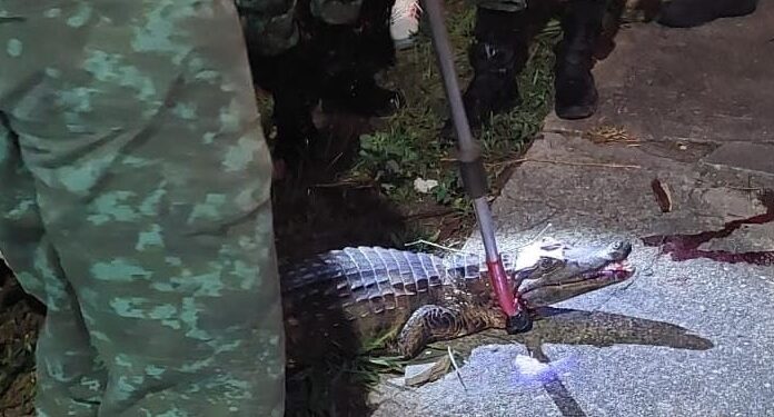 Um jacaré foi vítima de um atropelamento no bairro Parque 10, na zona Centro-Sul de Manaus, ao tentar atravessar a rua e chegar ao Parque do Mindu, uma das poucas reservas ecológicas da capital mais importante de Amazônia.