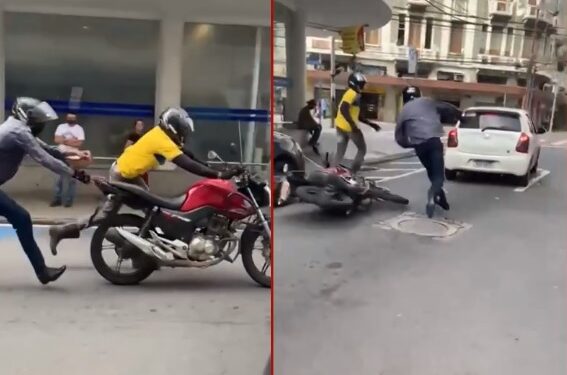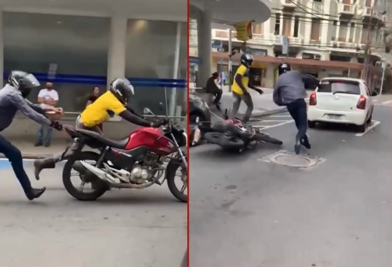 Um vídeo que circula nas redes sociais mostra o momento em que a dupla empurra uma motocicleta, que aparenta ter apresentado falha enquanto testemunhas gritam.