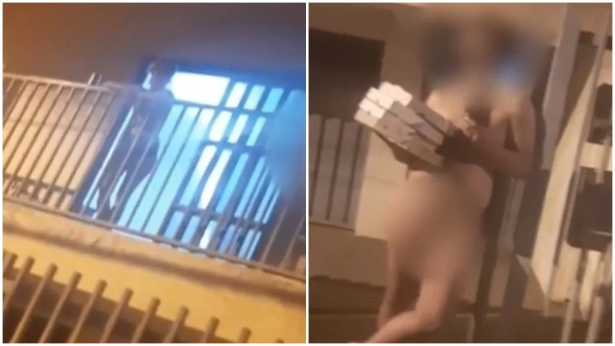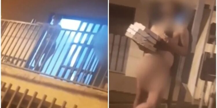 No vídeo, é possível ver que o entregador está em uma rua e, momentos depois, ele mostra um homem completamente nu, escorado a um poste. Com as pizzas nas mãos, o cliente tenta argumentar sobre o fato de estar sem roupa. Uma mulher também nua surge na sacada e diz algo, ainda a respeito da nudez.