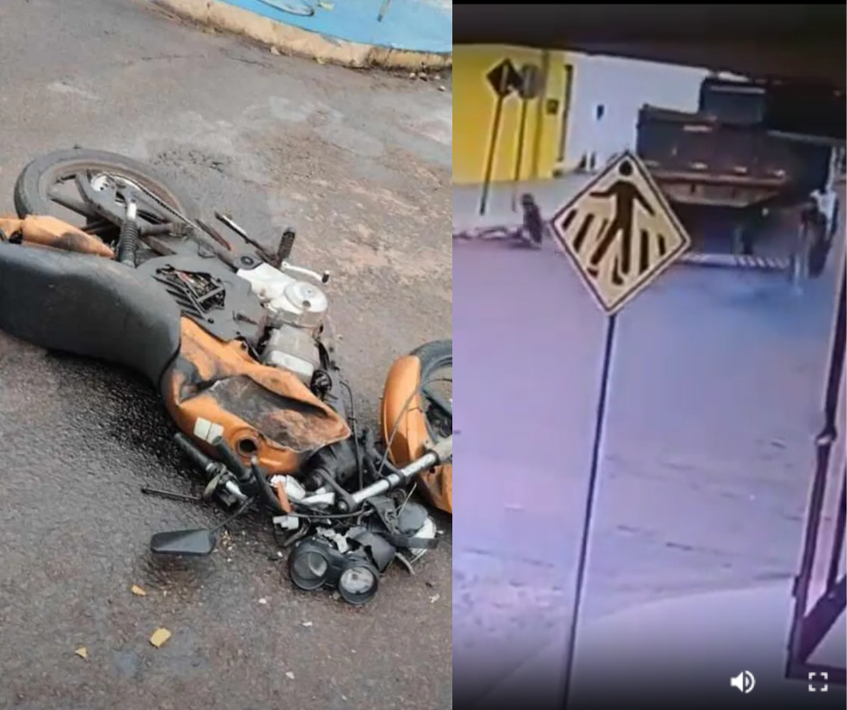 Isso porque o homem escapou da morte ao escorregar no asfalto pelo bairro da caçamba em movimento. A motocicleta ficou totalmente destruída e o acidente foi registrado por câmera.
