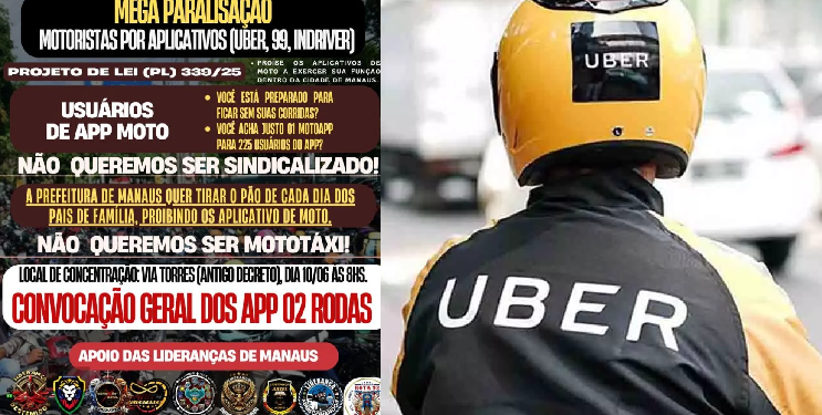 MANAUS (AM) – Na próxima terça-feira (10), a partir das 8h, centenas de motoristas e motociclistas que trabalham por aplicativos como Uber, 99 e InDrive vão paralisar e realizar uma grande manifestação em frente ao antigo prédio do Decreto, na avenida das Torres, em Manaus. O protesto tem como objetivo principal contestar a Lei nº 3.379, que ainda será votada, e é uma proposta do vereador Rodinei Ramos (Avante), que impõe restrições à atuação de mototáxis por aplicativo na cidade.