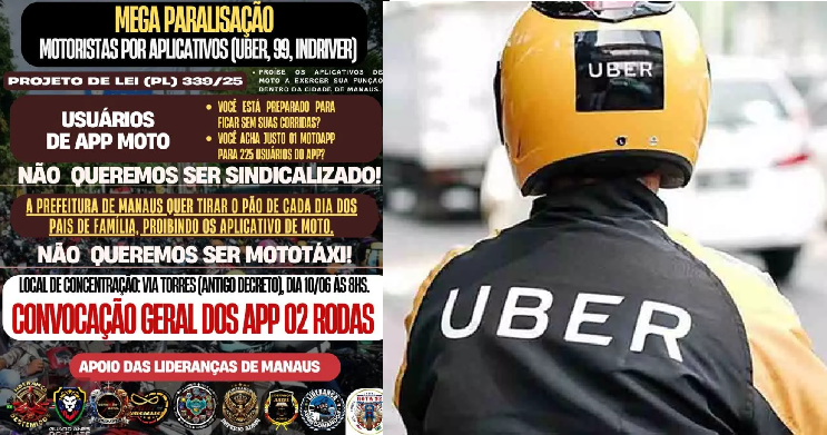 MANAUS (AM) – Na próxima terça-feira (10), a partir das 8h, centenas de motoristas e motociclistas que trabalham por aplicativos como Uber, 99 e InDrive vão paralisar e realizar uma grande manifestação em frente ao antigo prédio do Decreto, na avenida das Torres, em Manaus. O protesto tem como objetivo principal contestar a Lei nº 3.379, que ainda será votada, e é uma proposta do vereador Rodinei Ramos (Avante), que impõe restrições à atuação de mototáxis por aplicativo na cidade.