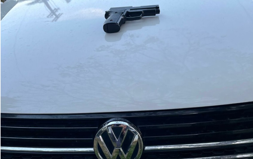 Com eles a polícia apreendeu um simulacro de arma de fogo, pistola, preta.