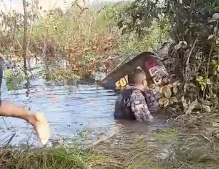 A viatura saiu da estrada após o motorista perder o controle em uma área alagada da via, aquaplanar e cair em um rio da região.