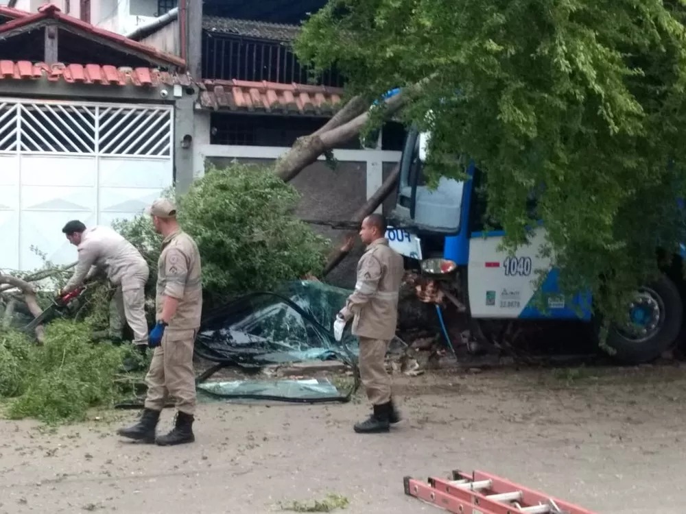 A frente do ônibus ficou destruída depois de bater na árvore. Os bombeiros precisaram serrar os galhos para que o veículo pudesse ser retirado.