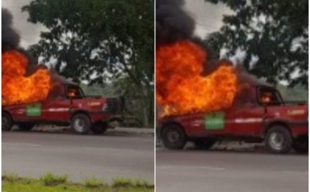 O carro em que ele estava, uma picape de cor vermelha, foi invadido pelas chamas, mas o motorista conseguiu sair do veículo a tempo. O carro ficou totalmente destruído.