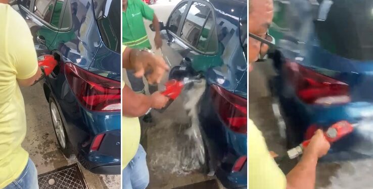 Nas imagens, o homem toma a mangueira das mãos de um frentista, faz questão que o combustível derrame e começa a jogar no veículo.