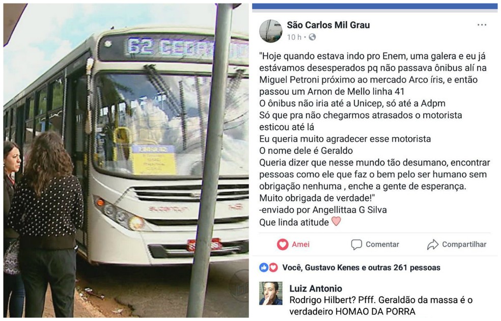 Na postagem, Angellita Silva disse que ela e outros candidatos esperavam o ônibus para ir ao local de prova. “Então passou um Arnon de Mello linha 41, o ônibus não iria até a Unicep, só até a Associação Desportiva da Polícia Militar (ADPM). Só que pra não chegarmos atrasados o motorista esticou até lá. Eu queria muito agradecer esse motorista. O nome dele é Geraldo! Queria dizer que nesse mundo tão desumano, encontrar pessoas como ele que faz o bem pelo ser humano sem obrigação nenhuma , enche a gente de esperança. Muito obrigada de verdade!”, escreveu.