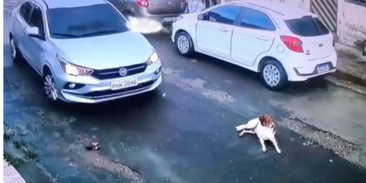 MANAUS – AM | Uma câmera de segurança registrou o momento que um carro atropela um cachorro que estava deitado em uma rua de Manaus. As imagens mostram que o condutor vê o animal e acelera para atingi-lo.