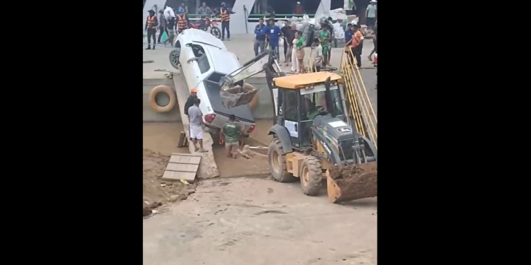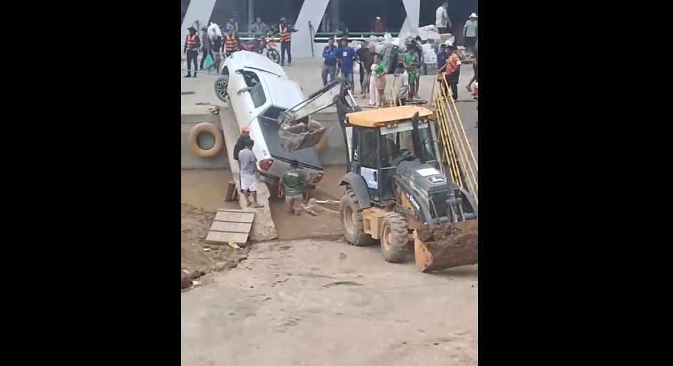Para evitar que a correnteza arrastasse o veículo, uma retroescavadeira foi rapidamente acionada. O operador utilizou a pá da máquina para estabilizar a picape e auxiliar na retirada, contendo maiores danos.