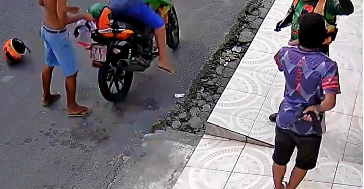 De imediato mototaxista levanta as mãos em sinal de rendição, e logo dois outros homens chegam tomando posse da motocicleta. O trio foge no veículo, deixando somente os capacetes para trás.