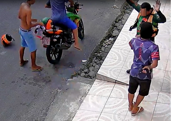 De imediato mototaxista levanta as mãos em sinal de rendição, e logo dois outros homens chegam tomando posse da motocicleta. O trio foge no veículo, deixando somente os capacetes para trás.