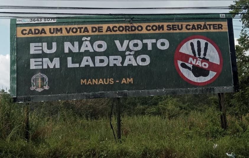 MANAUS (AM) – Um outdoor do Movimento Conservador do Amazonas foi instalado no Ponta Negra, bairro de classe alta da Zona Oeste de Manaus. Com críticas ao ex-presidente Luiz Inácio Lula da Silva (PT), a imagem contém as frases “cada um vota de acordo com seu caráter” e “eu não voto em ladrão”, ao lado de um desenho de uma mão sem o dedo mindinho, em referência à Lula, com um aviso de proibido e a palavra “NÃO”.