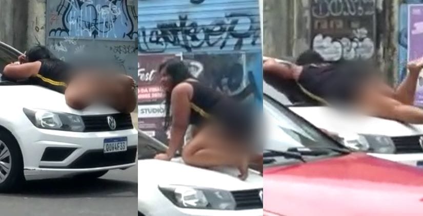 A “mulher-aranha”, não identificada, usava um vestido preto e não queria sair de cima de um veículo Gol branco que era dirigido por um homem. Aparentemente sob efeito de bebidas alcoólicas, ela chegou a gritar: “Ai, ai, ai, eu te amo”, e o homem continuava não dando “moral”.