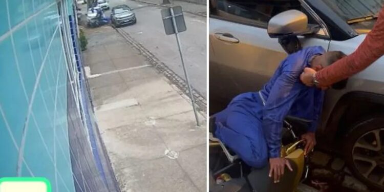 SÃO PAULO | Um assaltante foi preso e outro fugiu após ambos tentarem roubar um homem que estava chegando em casa de moto em Santos, no litoral de São Paulo, durante o fim de semana. Ele foi salvo pela esposa, que jogou o carro em cima dos criminosos. Uma câmera de monitoramento flagrou o crime.