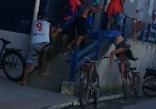 No decorrer da confusão, parte do corrimão, feito de madeira, foi arrancado e um dos envolvidos utilizou o objeto para agredir as pessoas. Nesse momento, a mulher foi atingida e, mesmo assim, partiu para cima do agressor.