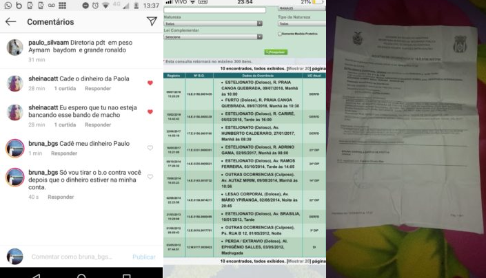 De acordo com a amiga que indicou o suposto golpista, Paulo teria falado que Bruna só teria trazido problemas para ele, que o mesmo iria devolver o dinheiro, foi então ele pediu para ela mandar os dados da conta que ele iria depositar o dinheiro. A vítima passou os dados e ele não fez o depósito.