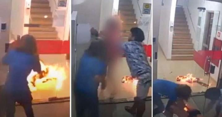 Nas imagens, a aparece a mulher desesperada tentando apagar as chamas do seu corpo. Uma outra mulher de camisa azul saía do prédio no momento do acidente e ajuda a vítima. Outros dois moradores também aparecem e tentam abrir a porta de vidro para socorrer a moça.