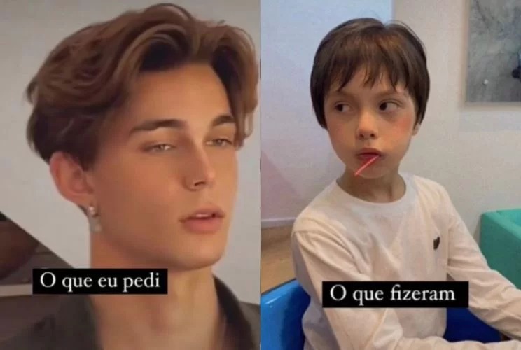 Só que a expectativa logo se tornou aflição para Thielly, que viu que o corte não estava saindo como o esperado. No vídeo, ela conta que o cabeleireiro deixou a parte da frente do cabelo mais curta, como uma franja. “Eu até comentei com o profissional (que ele tinha cortado muito) e ele disse que sabia o que estava fazendo. Quando finalizou, meu filho olhou e ficou triste dizendo que não havia gostado da franja e que estava feio e queria remover. O profissional a todo momento dizia que não tinha máquina do tempo”, relata.